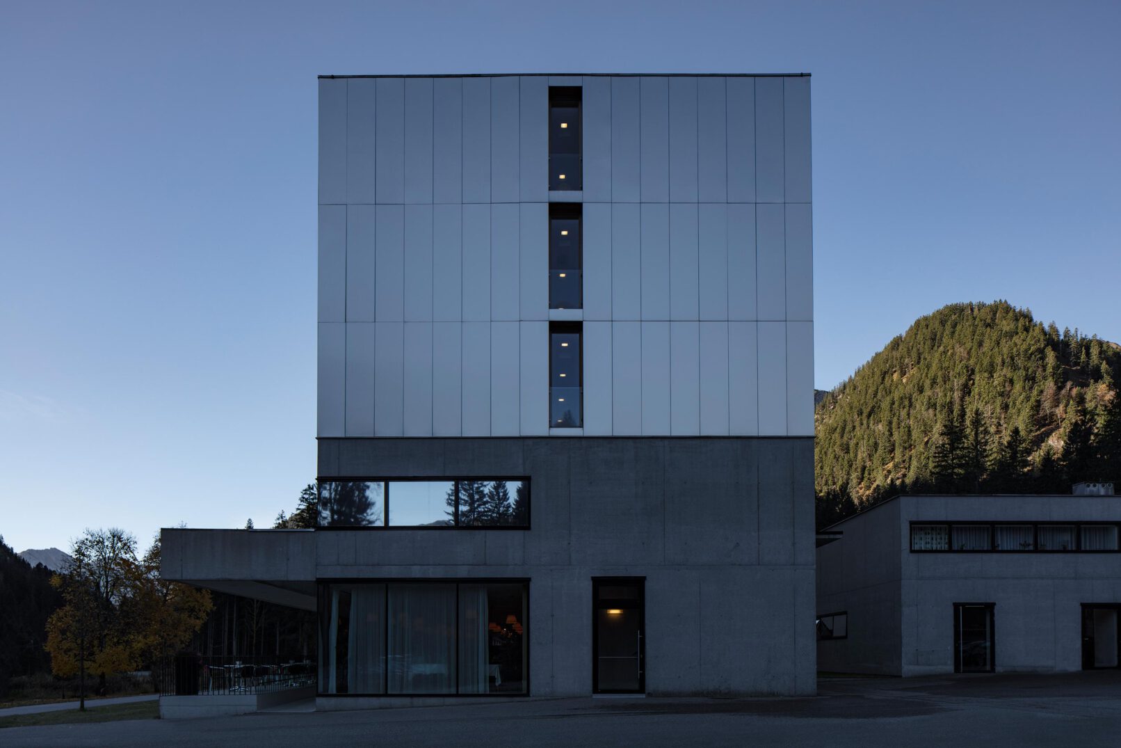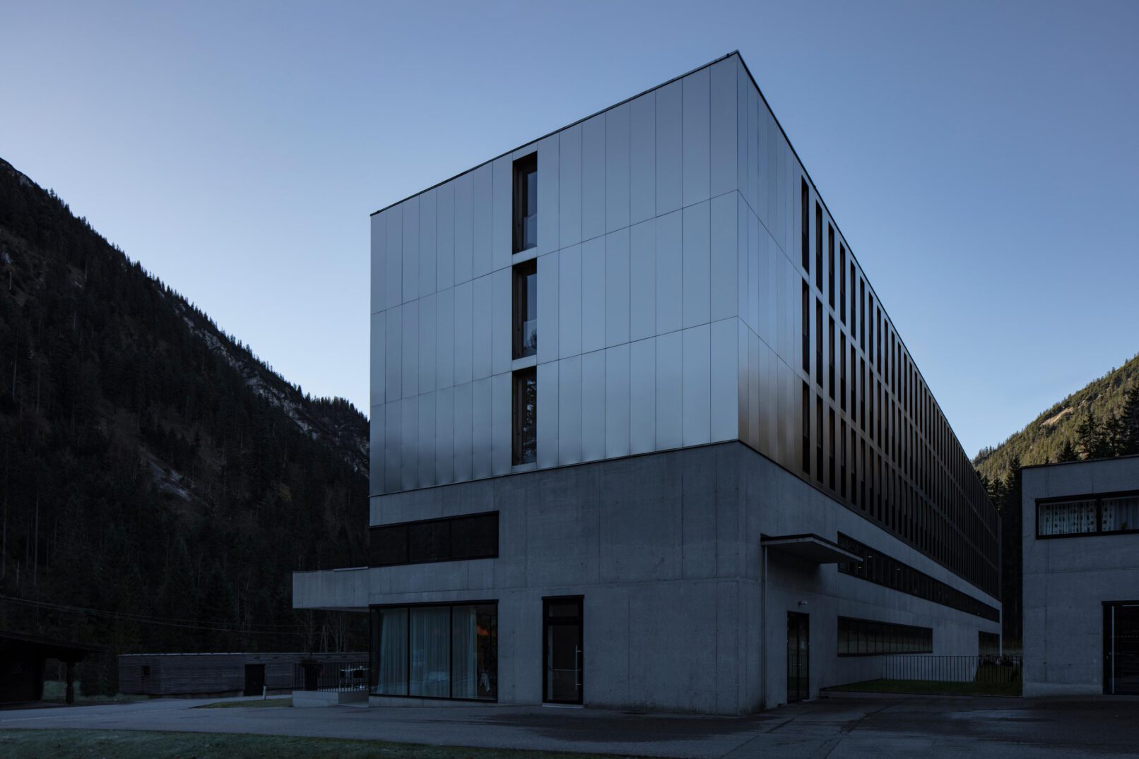 Dabei ist das Gebäude eine typische Bauart der Alpen: Unten Stein und oben Holz. So ist das neue Alpenhotel Ammerwald sachlich betrachtet eine zeitgemäße Umsetzung dieser regionalen Bauart. Vom Keller bis zum ersten Stock ein Betonbau, der von tragenden Massivholzwänden in den restlichen drei Stockwerke abgelöst wird.