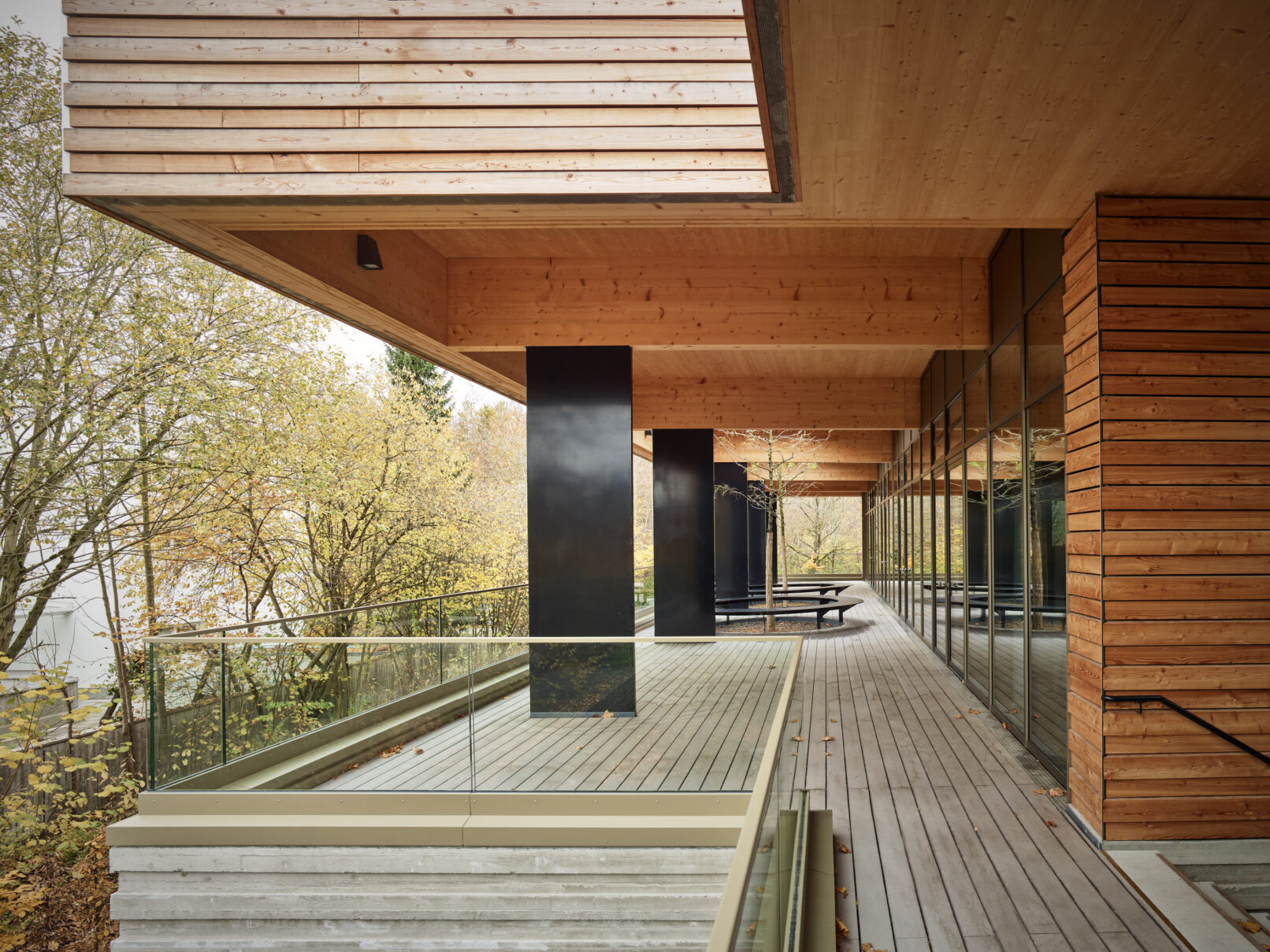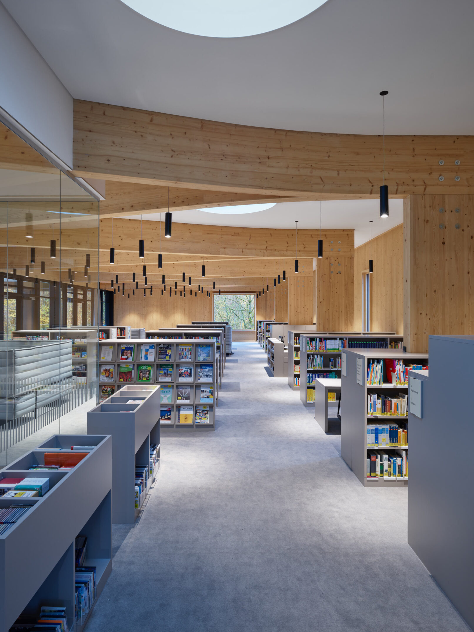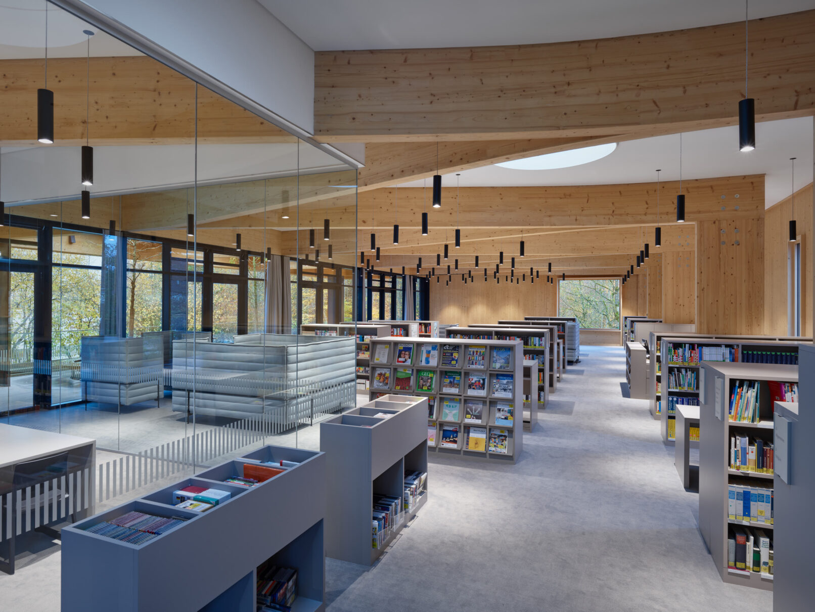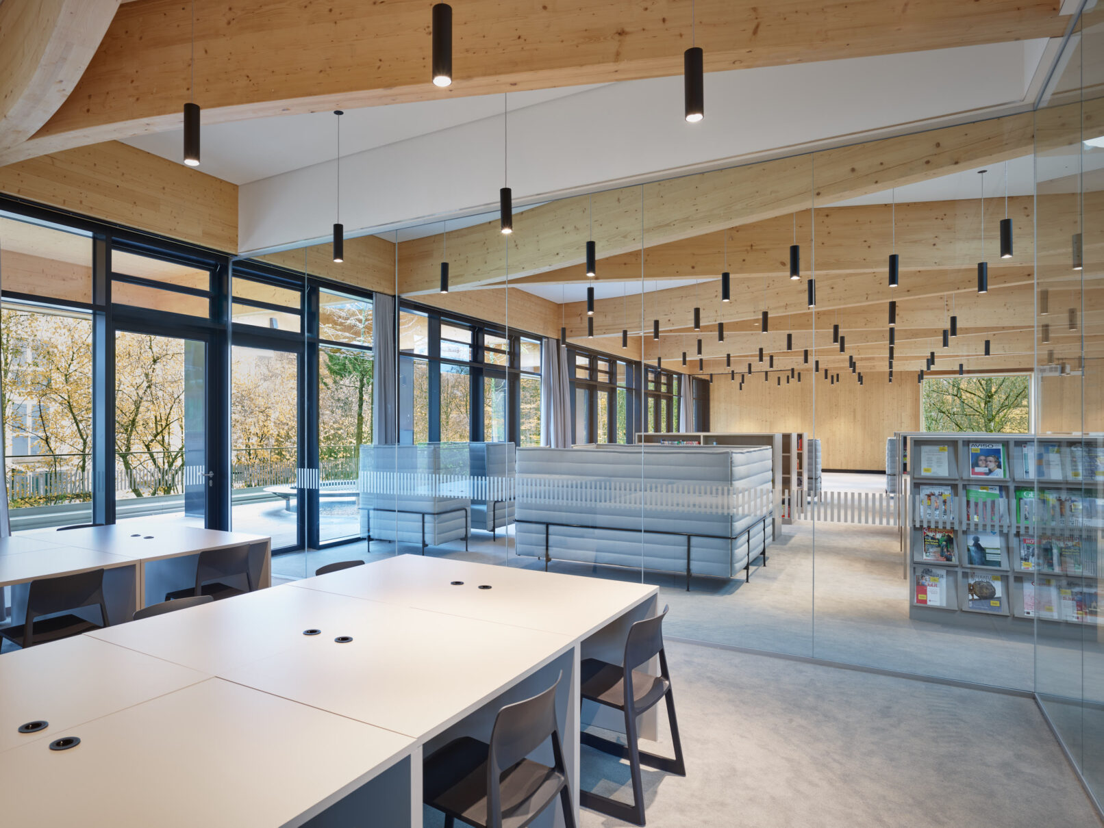 Geht man weiter in das Innere der Bibliothek wird es nochmals ruhiger, gar behaglich – trotz der enormen Größe des Raumes! Dabei werden den Schülern viele Arbeits- und Rückzugsorte mit Blick ins Grüne geboten. Die sichtbaren Massivholzwände, die lange Glasfront und das Tragwerk nachempfundener Astgabelungen ergeben ein harmonisches Spiel zwischen Innen- und Außenraum.