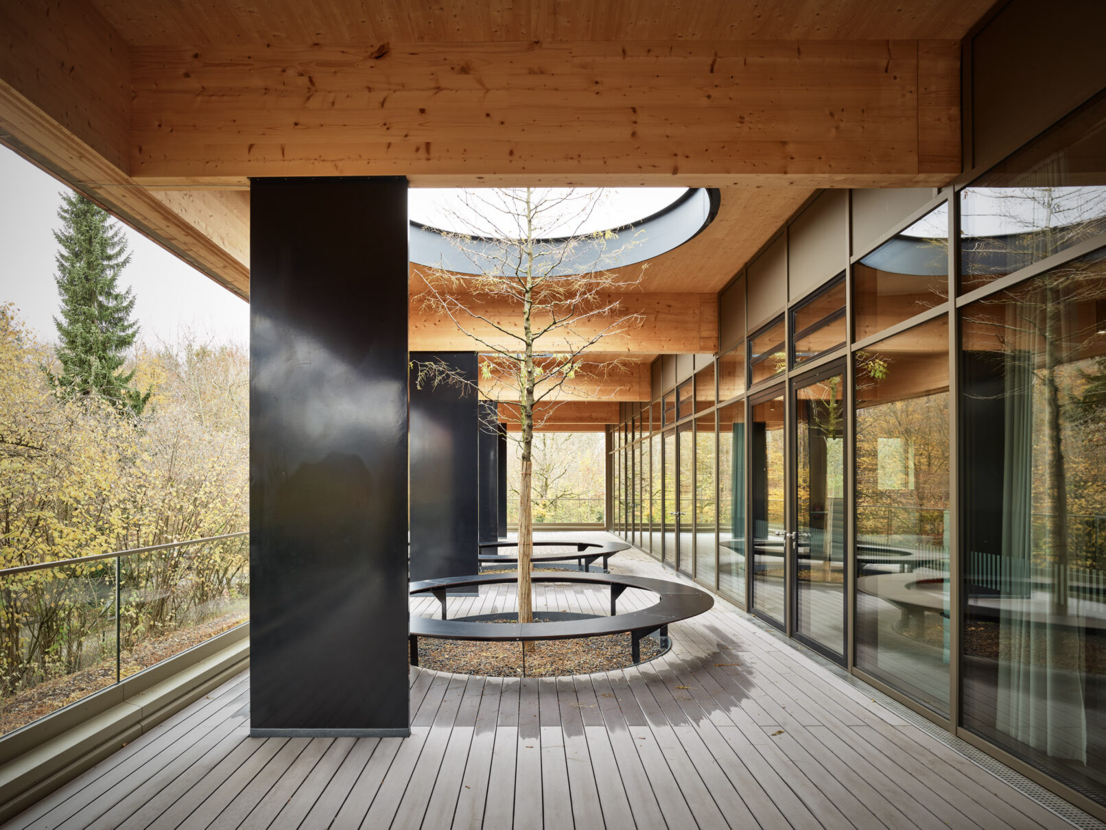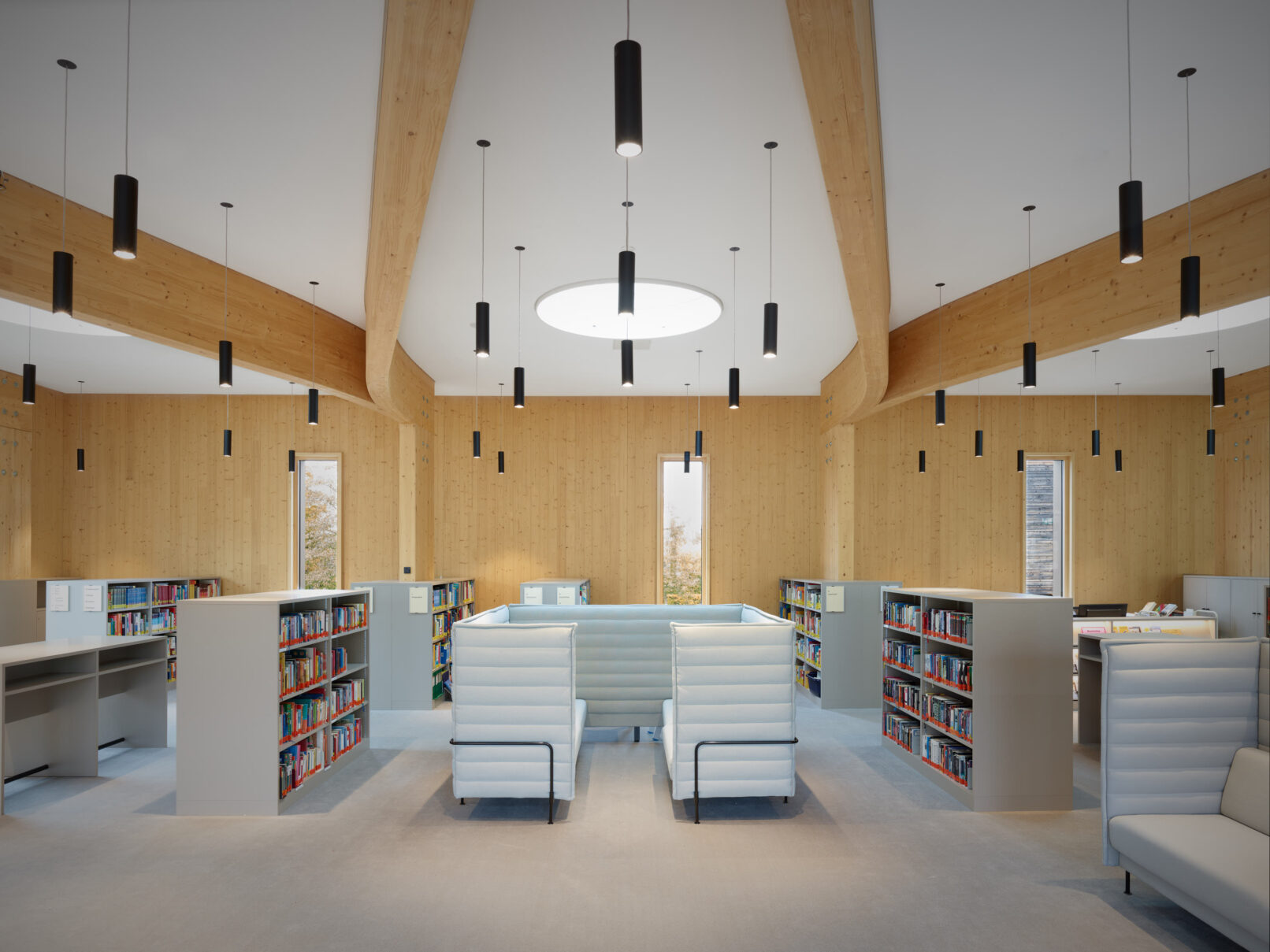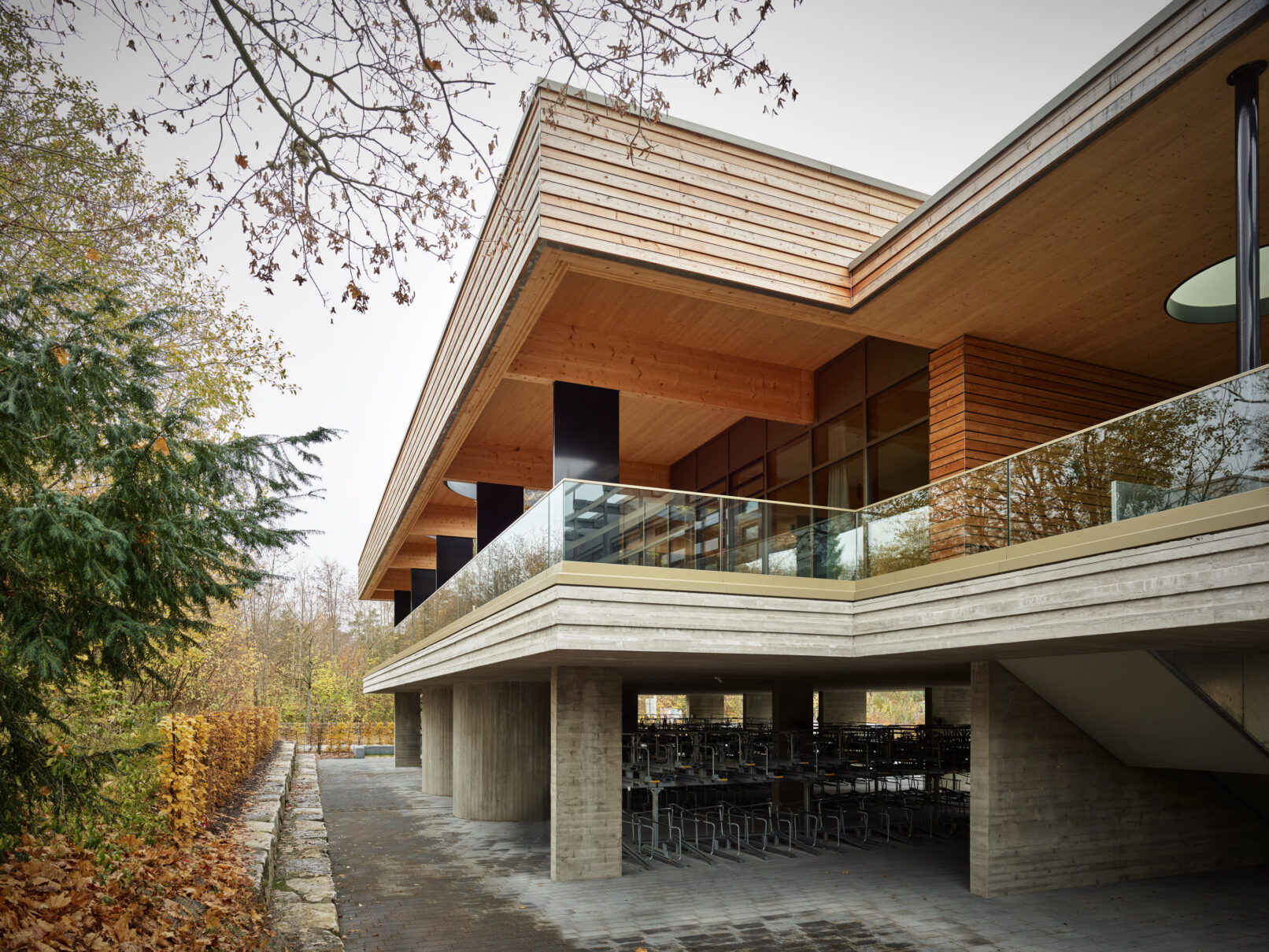 Geht man weiter in das Innere der Bibliothek wird es nochmals ruhiger, gar behaglich – trotz der enormen Größe des Raumes! Dabei werden den Schülern viele Arbeits- und Rückzugsorte mit Blick ins Grüne geboten. Die sichtbaren Massivholzwände, die lange Glasfront und das Tragwerk nachempfundener Astgabelungen ergeben ein harmonisches Spiel zwischen Innen- und Außenraum.