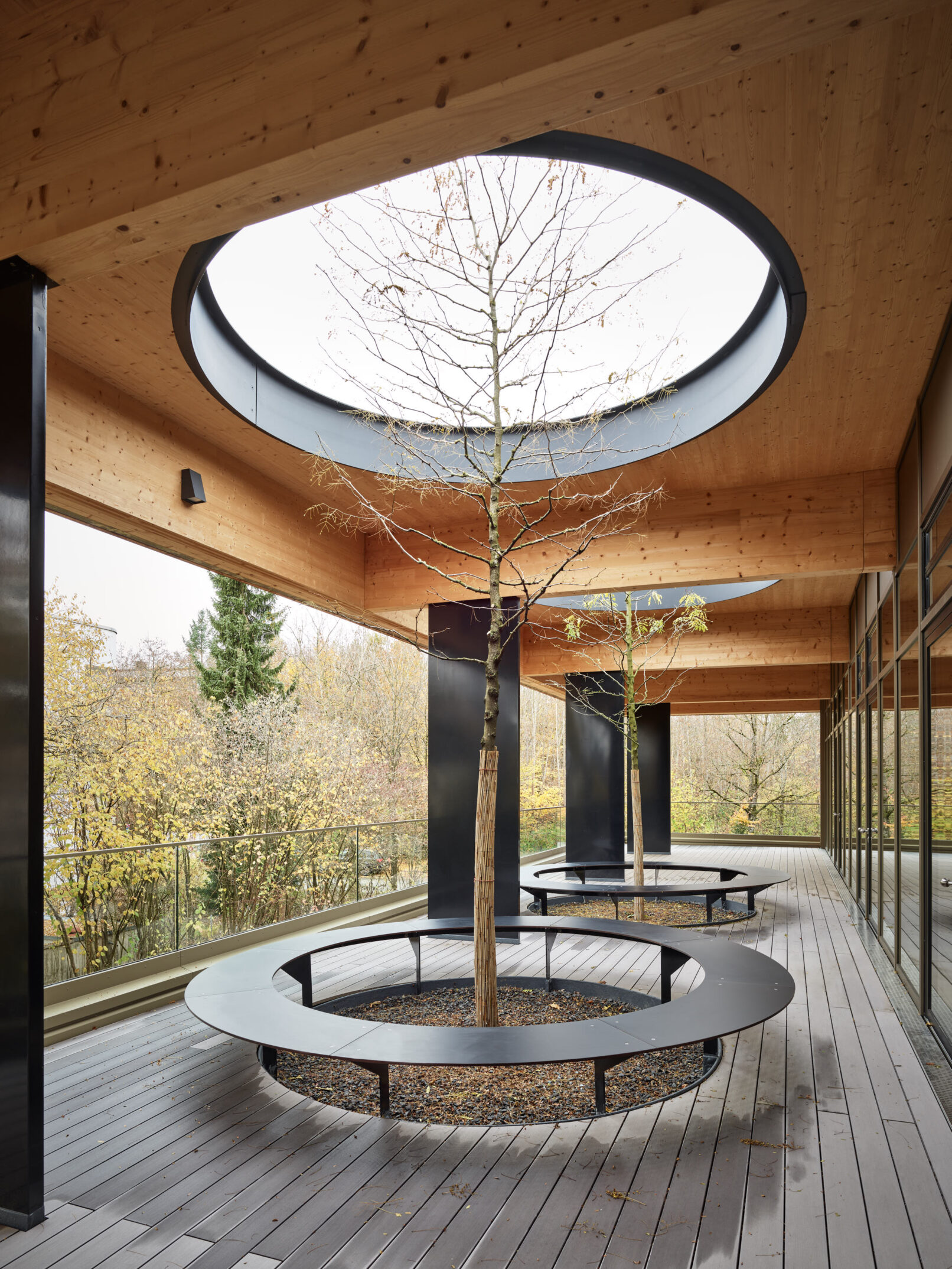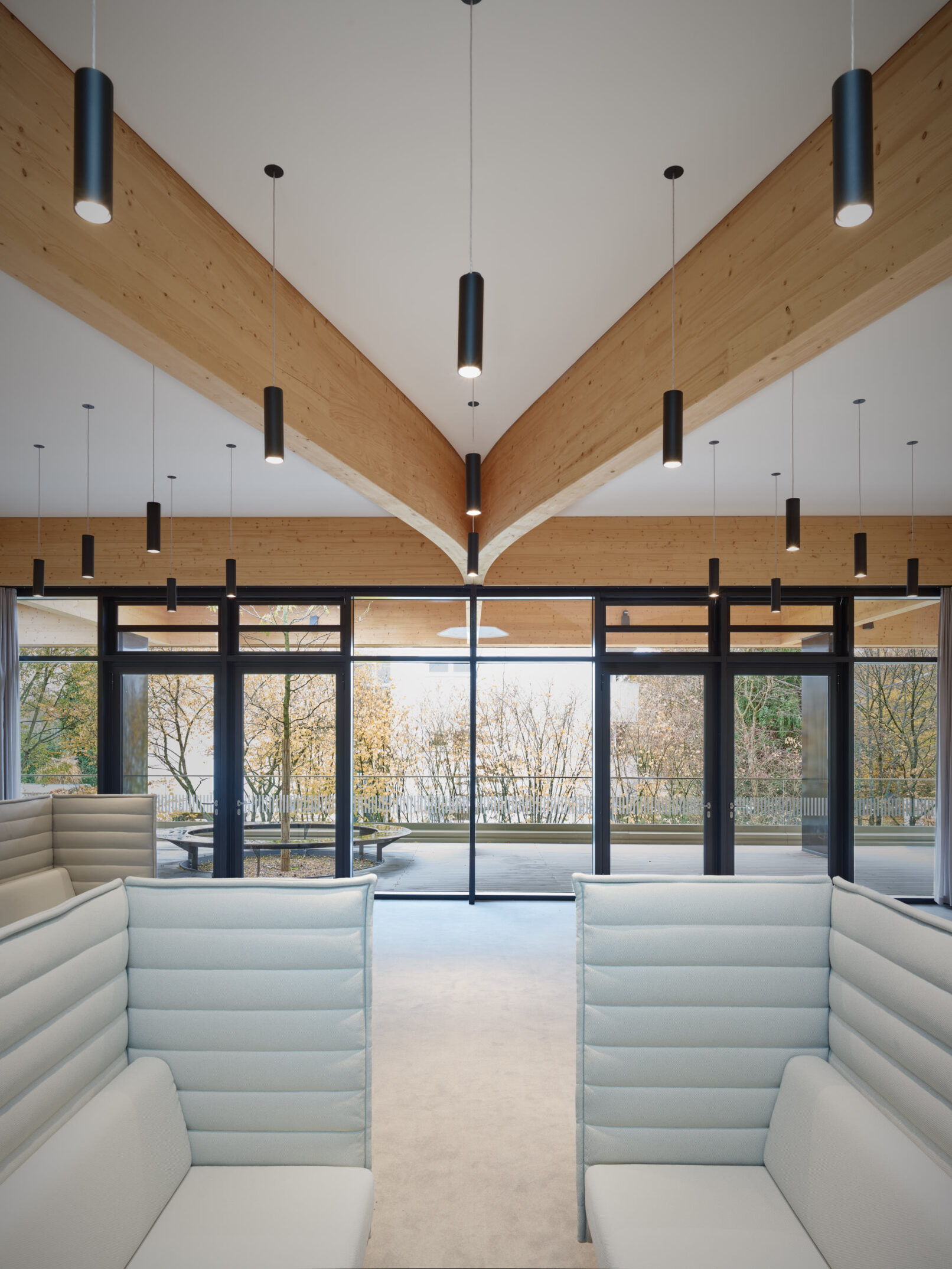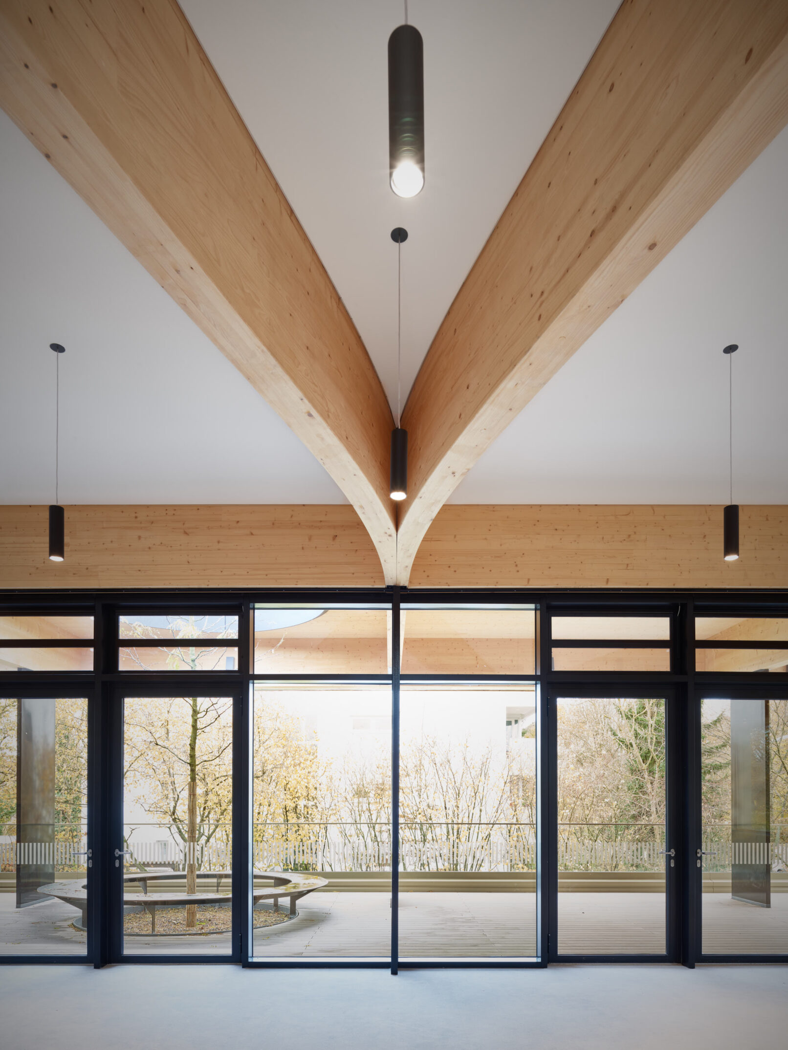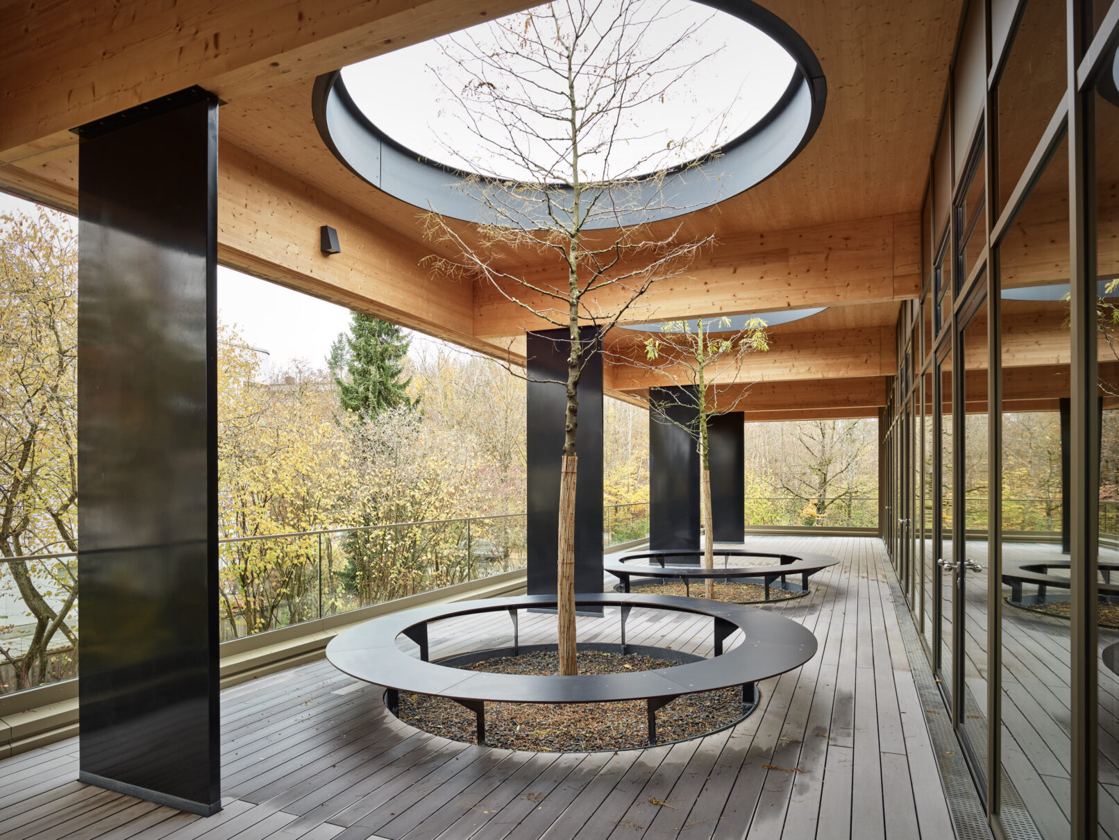Geht man weiter in das Innere der Bibliothek wird es nochmals ruhiger, gar behaglich – trotz der enormen Größe des Raumes! Dabei werden den Schülern viele Arbeits- und Rückzugsorte mit Blick ins Grüne geboten. Die sichtbaren Massivholzwände, die lange Glasfront und das Tragwerk nachempfundener Astgabelungen ergeben ein harmonisches Spiel zwischen Innen- und Außenraum.