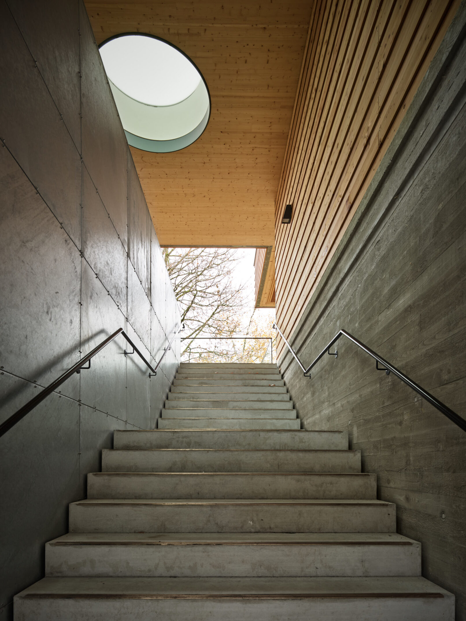Macht man sich vom Pausenhof zur Bibliothek in den 1. Stock auf, betritt man einen dunklen Treppenaufgang aus Beton und Eisen, der mit jedem Schritt heller und heller wird, bis man schließlich von Holz, Licht und Bäumen umgeben ist. Der Besucher erlebt eine regelrechte Transformation des Ortes: Weite, Ruhe und Natur sind das Ergebnis dieses neu geschaffenen Ortes.