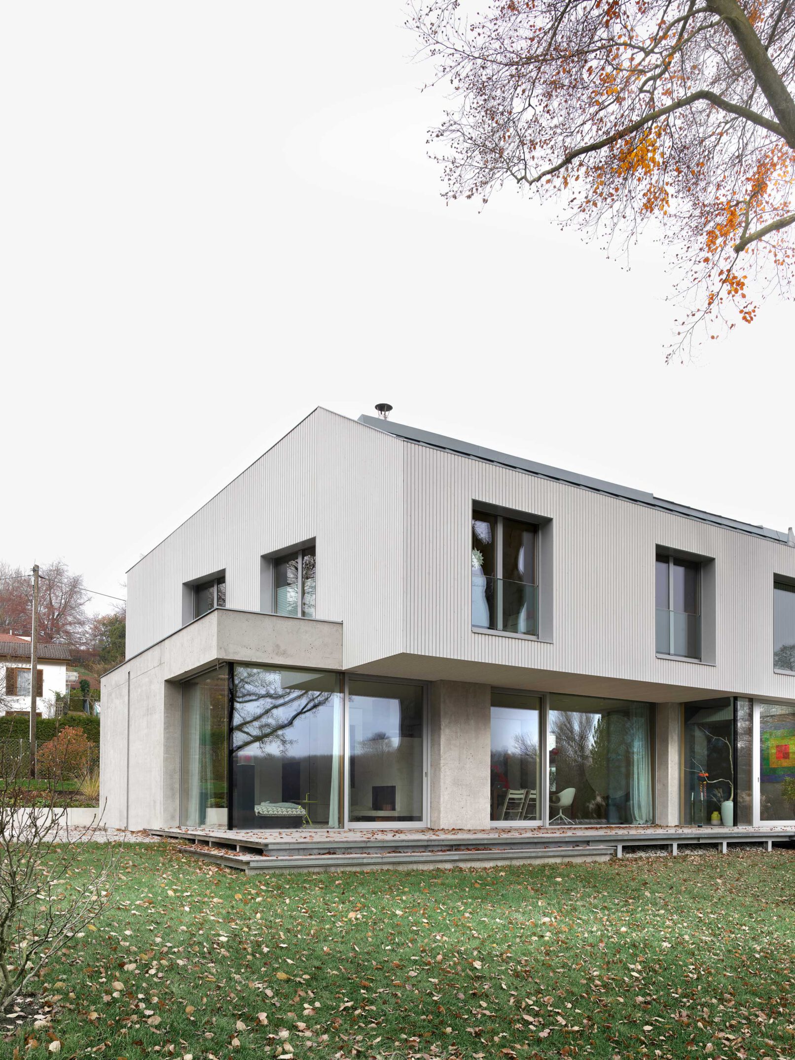Im Vorfeld des Fotoshootings habe ich nach einer Lichtstimmung recherchiert, die mir für das Bauwerk passend erschien: Ein kühler Herbstmorgen, der die graue Sichtbeton- und Holzfassade harmonisch hervorhebt. Beim Fotoshooting selbst war ich positiv überrascht, als die Sonne leicht durch den Nebel blinzelte und auf dem Rasen und vor allem auf den Fensterschreiben ihr silbriges Herbstlicht hinterließ.
