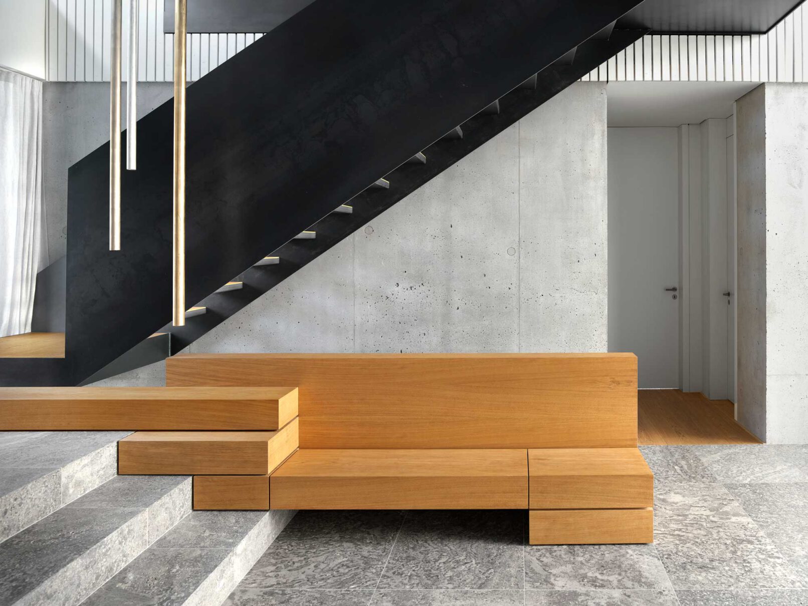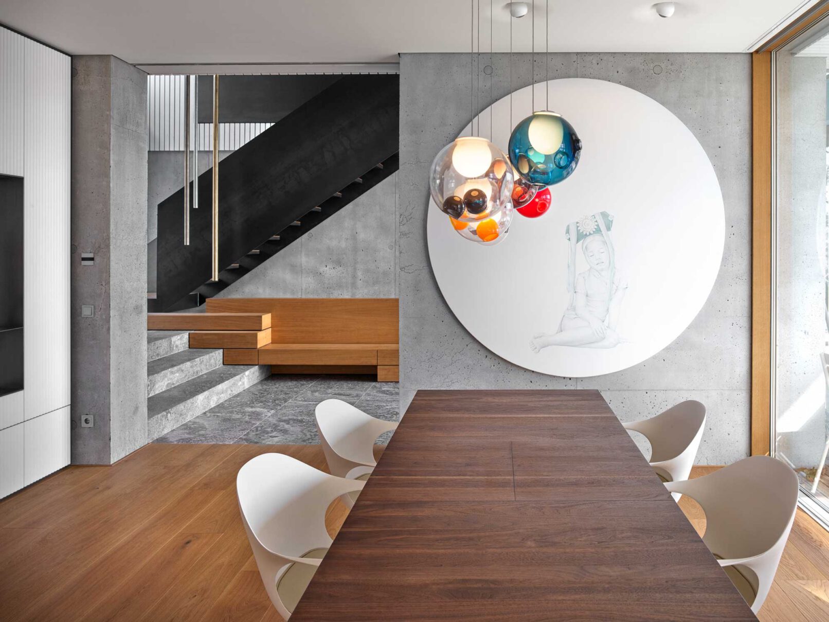 Im Mittelpunkt, architektonisch als auch konzeptionell, ist der Eingangsbereich. Schon beim klingeln an der Gartentüre, lässt der Durchblick durch das Haus die schöne Aussicht erahnen. Wird man herein gebeten, erlebt man einen zauberhaften Ausblick auf den Pilsensee, der durch die Architektur wie ein Gemälde einrahmt wird.