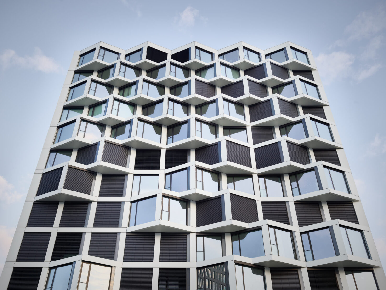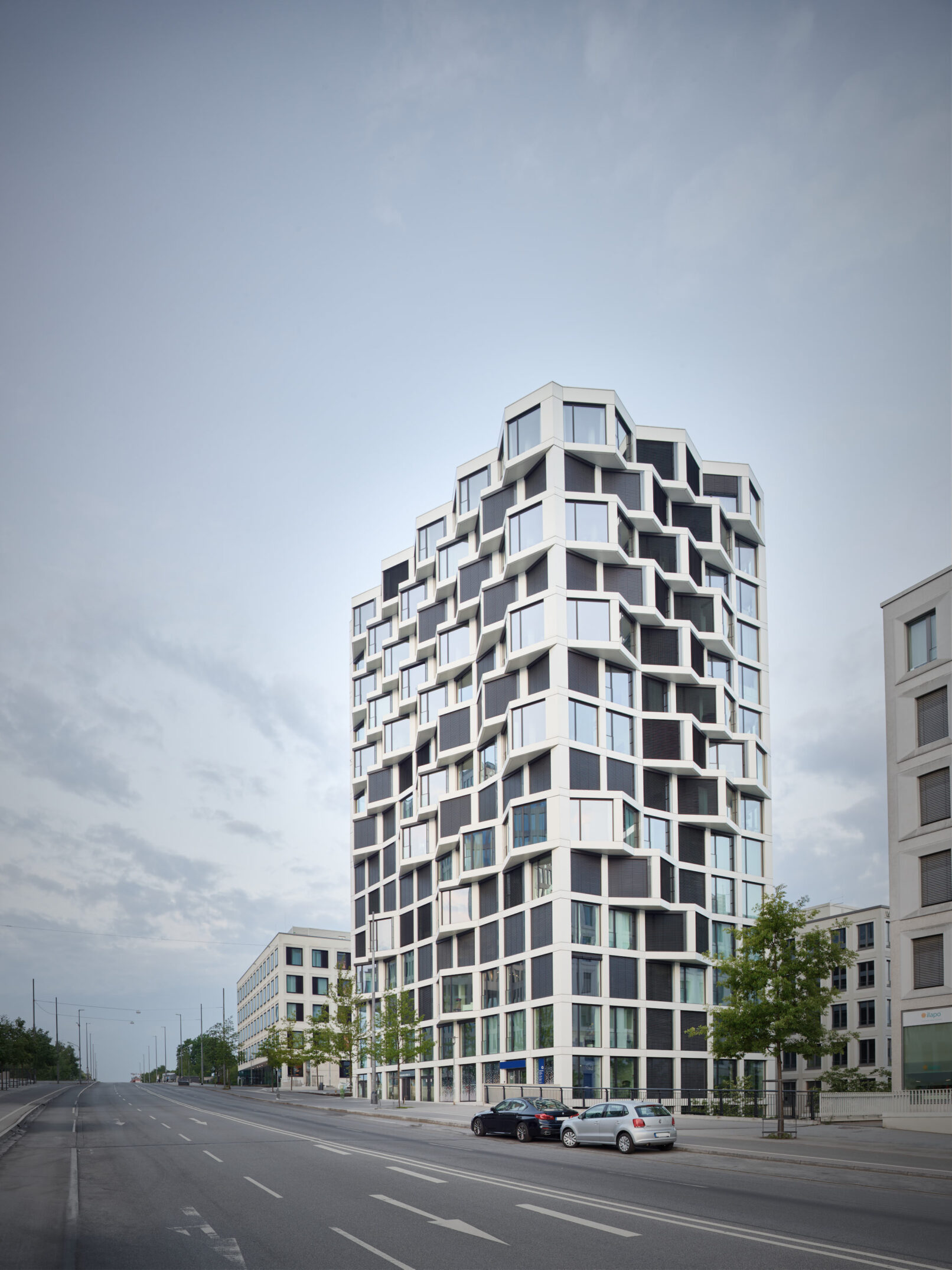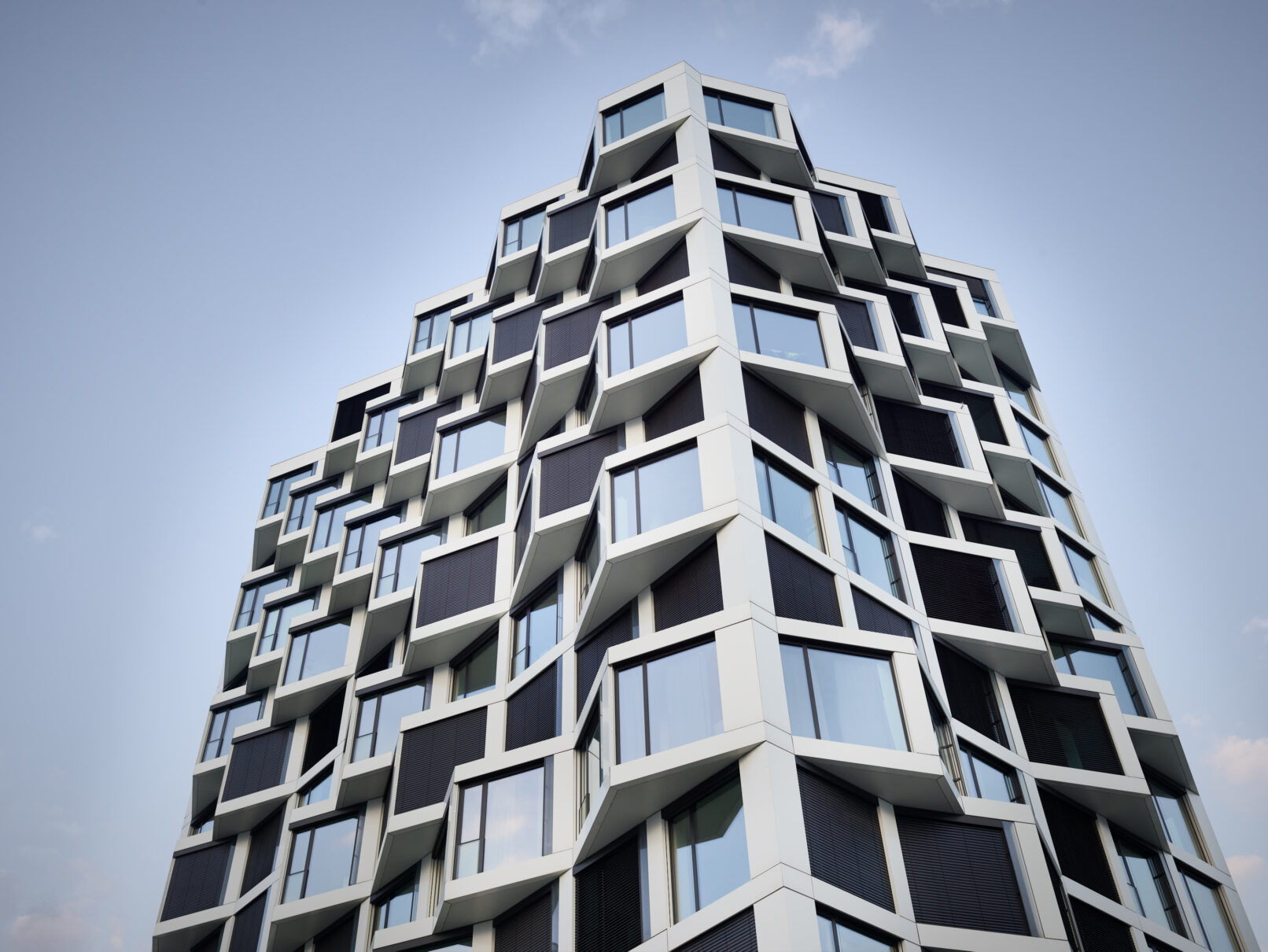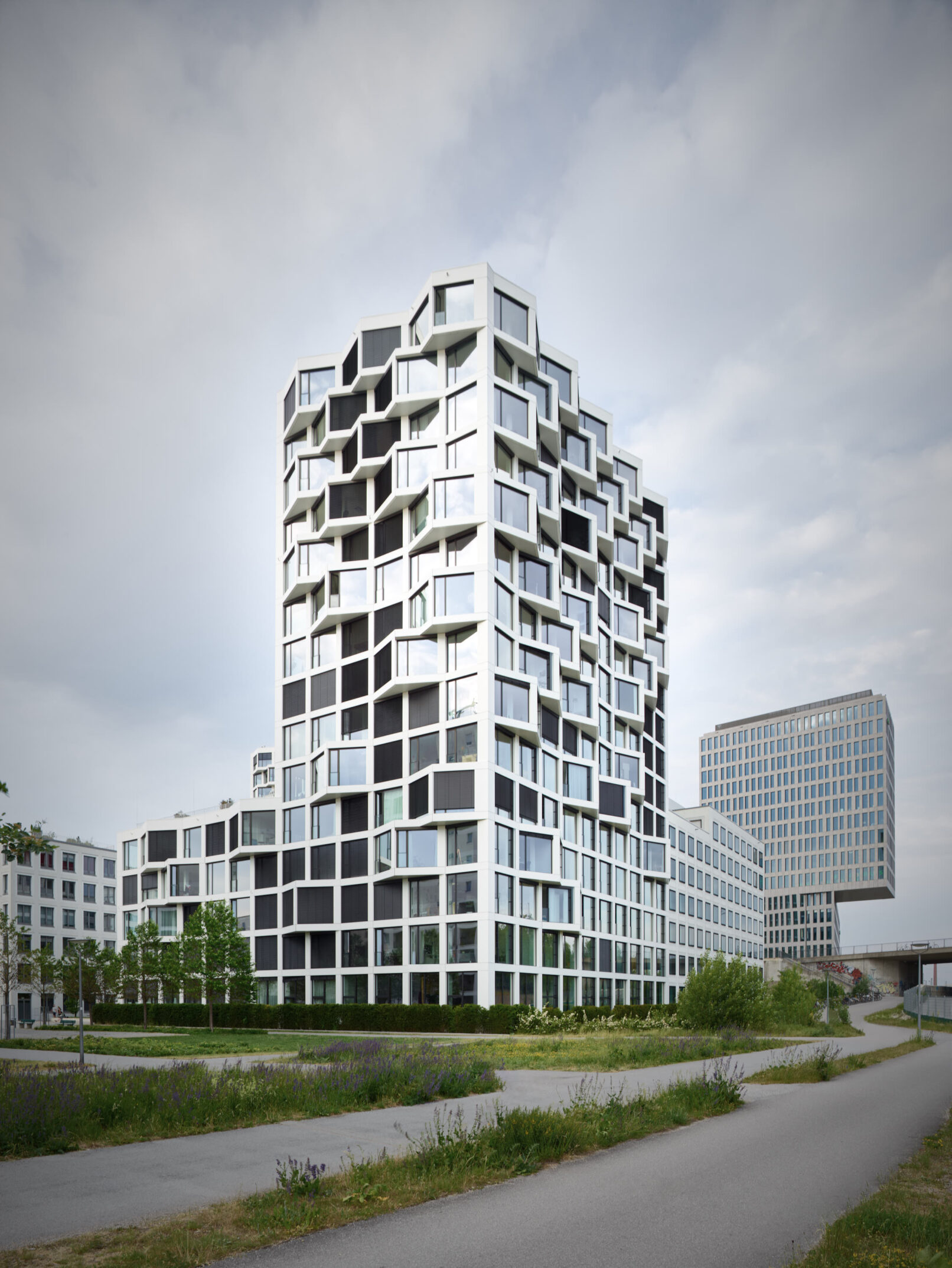Die Architektur der Friends Towers zeichnet sich durch seine versetzte, kubische Geometrie aus. Die zwei weißen Türme umfassen ein Areal, das Wohnungen zwischen 45 und 145 Quadratmetern beherbergen. Dabei haben viele Wohnungen Zugang zu einem dreieckigen Erker, die dem Bauwerk seinen optische Präsenz geben.