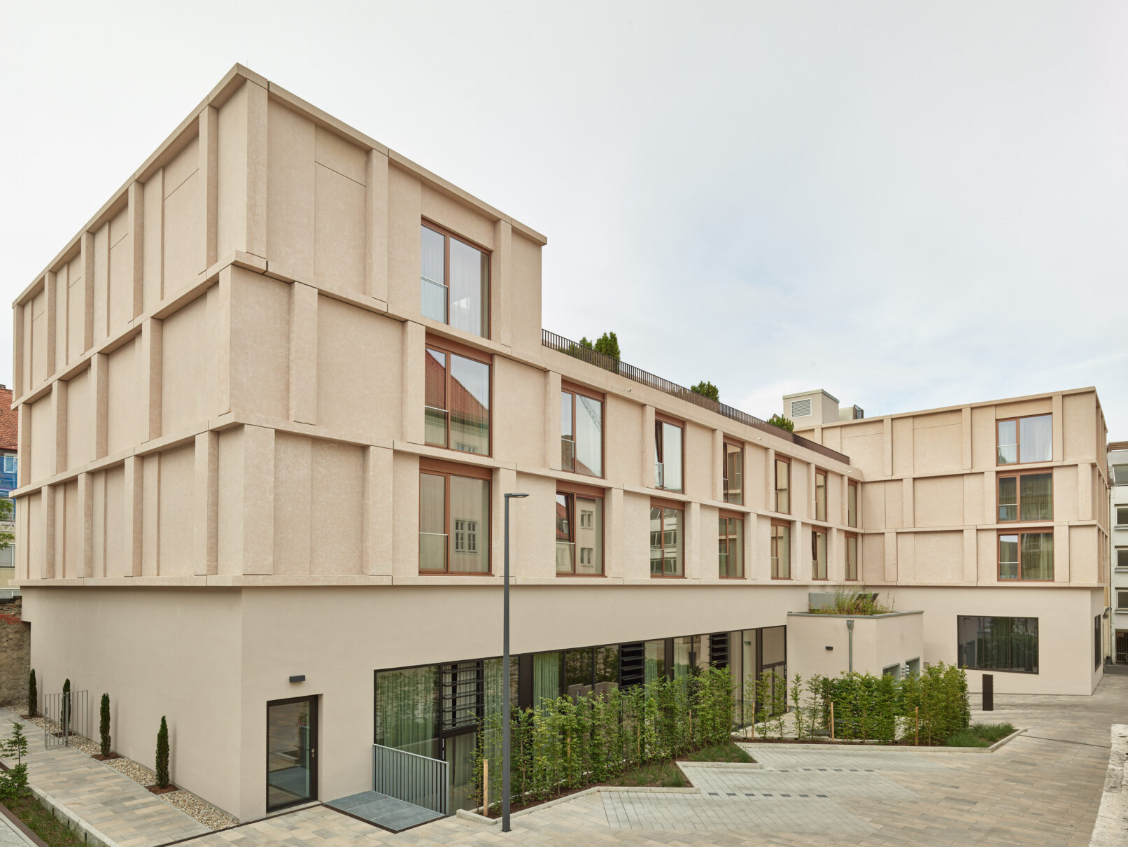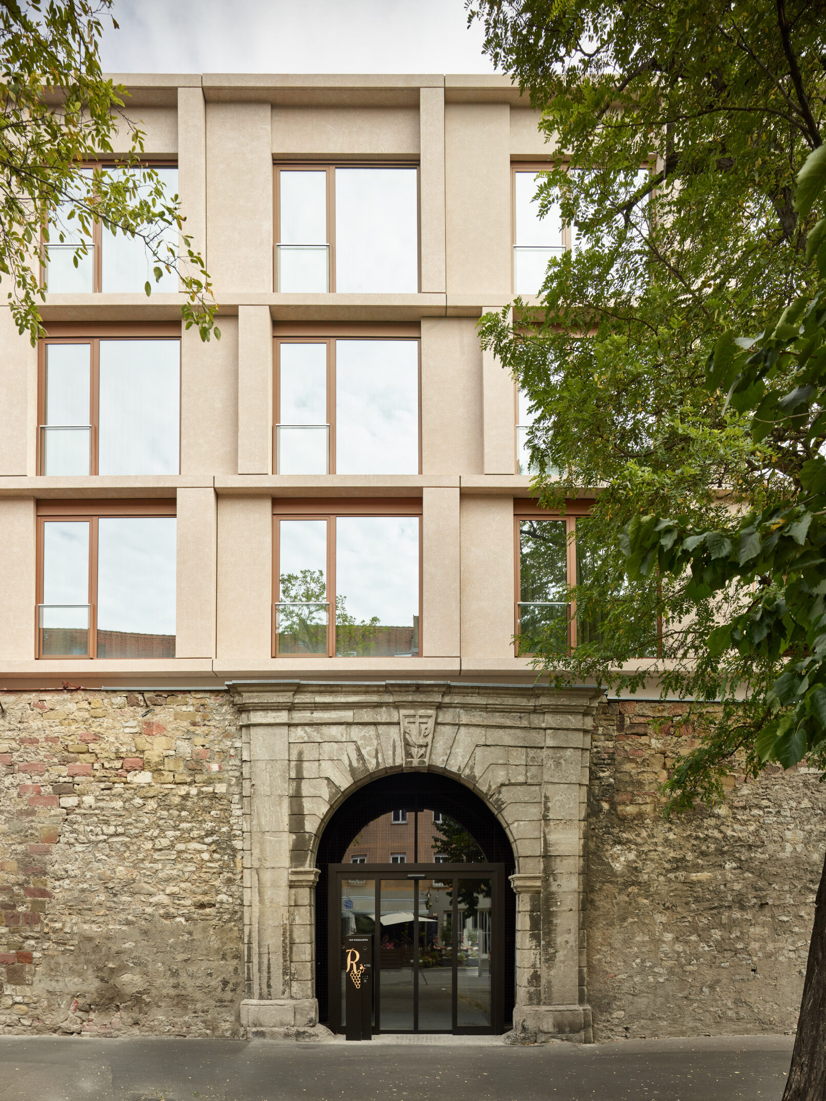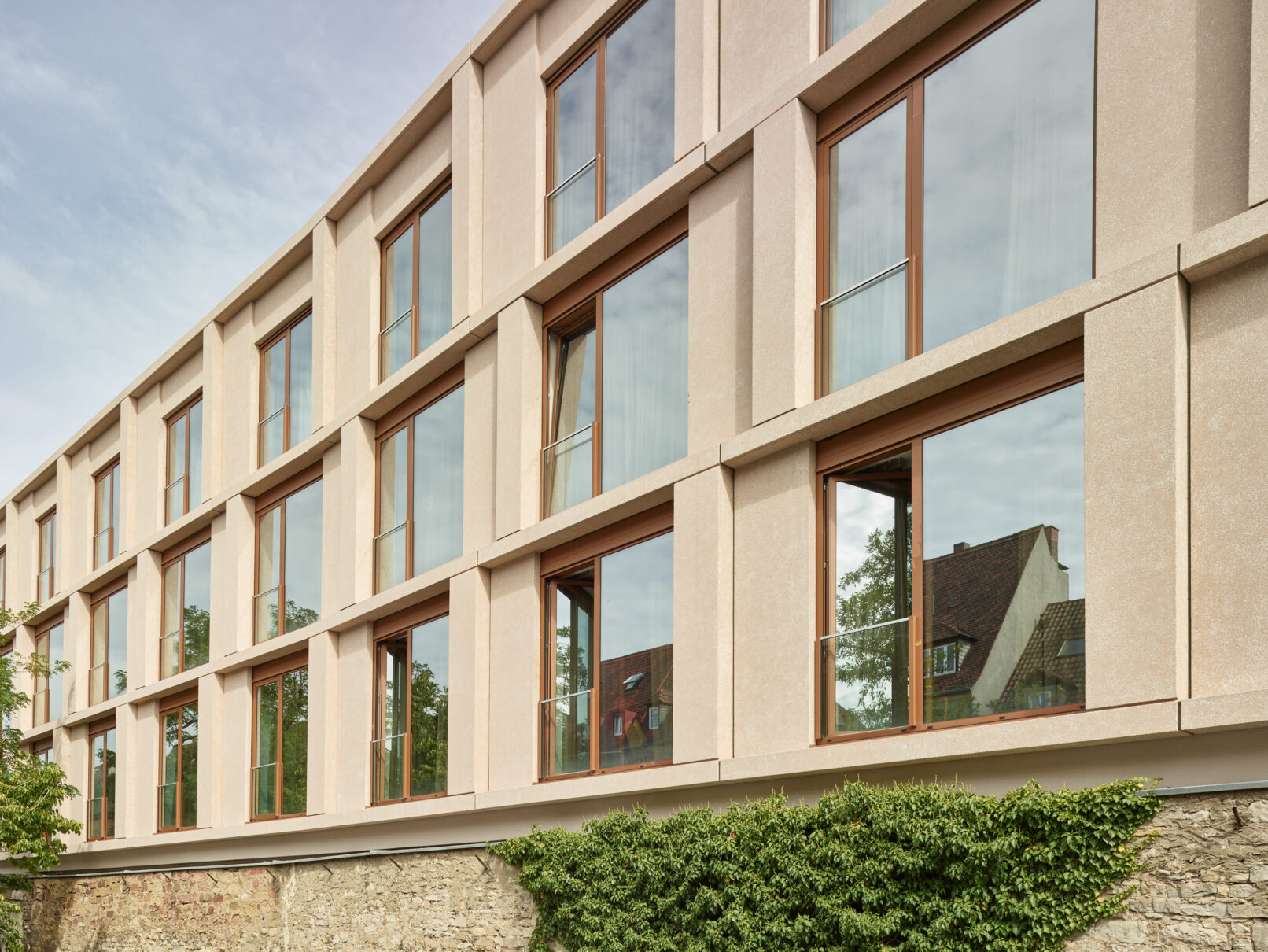 Auf den historischen Klostermauern ist ein viergeschossiger Neubau mit 58 Hotelzimmern entstanden. Dabei spielt die neue Fassade aus hochwertig geätzten und sandgestrahlten Betonelementen von der Firma Hemmerlein eine entscheidende Rolle.