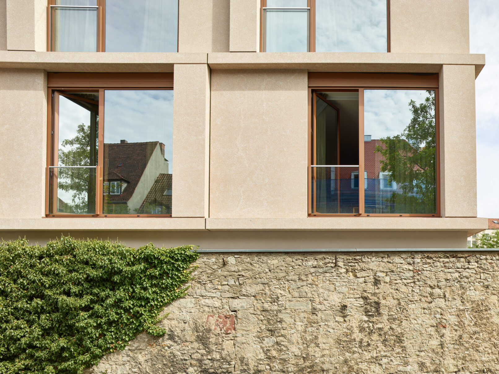 Sie erzeugt ein harmonisches Gesamtbild, da der Architekt Rainer Kriebel bei der Fassadengestaltung stark auf die bestehende Klostermauer Bezug nimmt – sei es farblich, als auch materiell. Und trotzdem grenzt sich der neue Teil des Gebäudes durch die moderne Formensprache der Betonelemente konstruktiv ab.