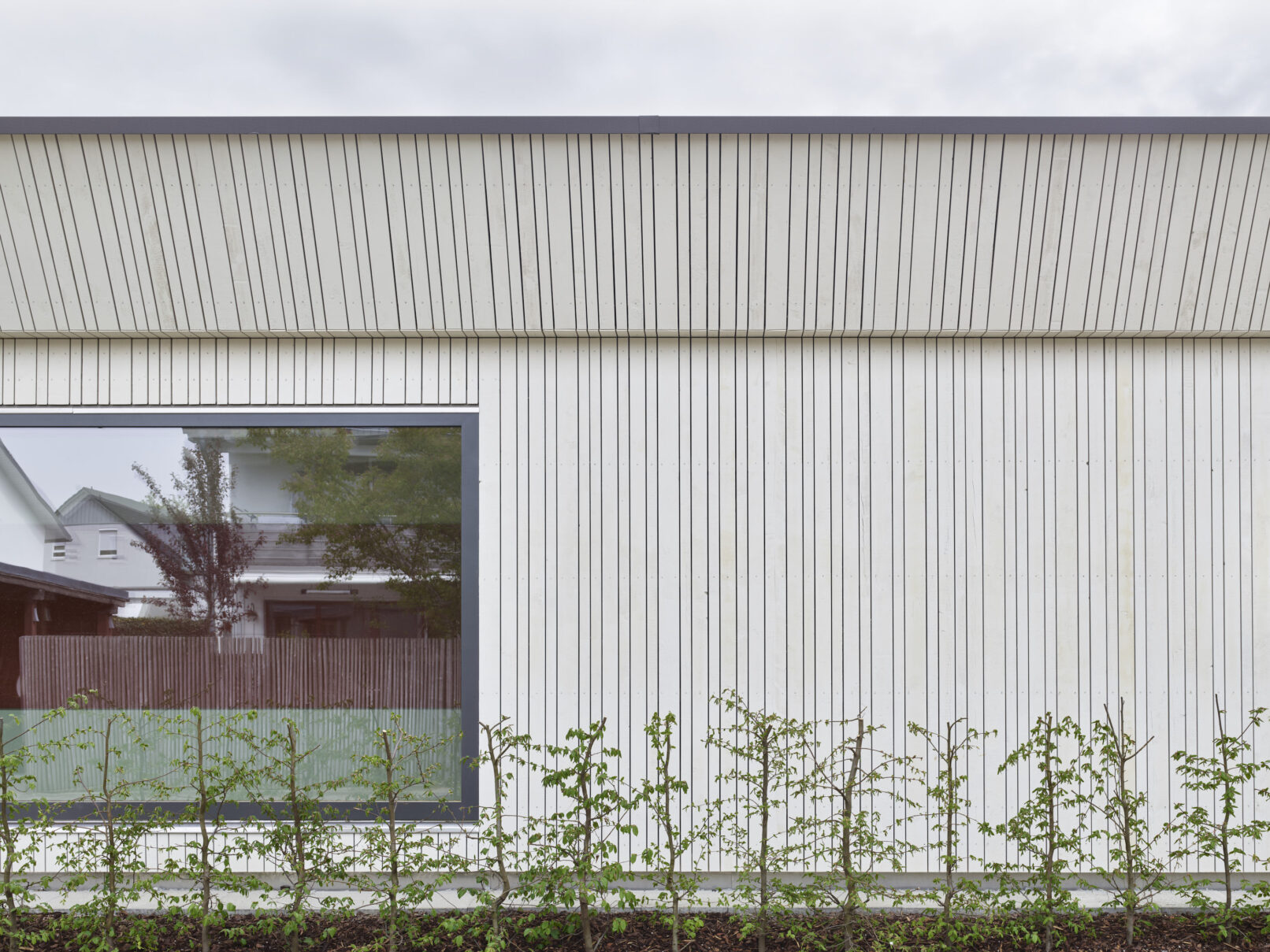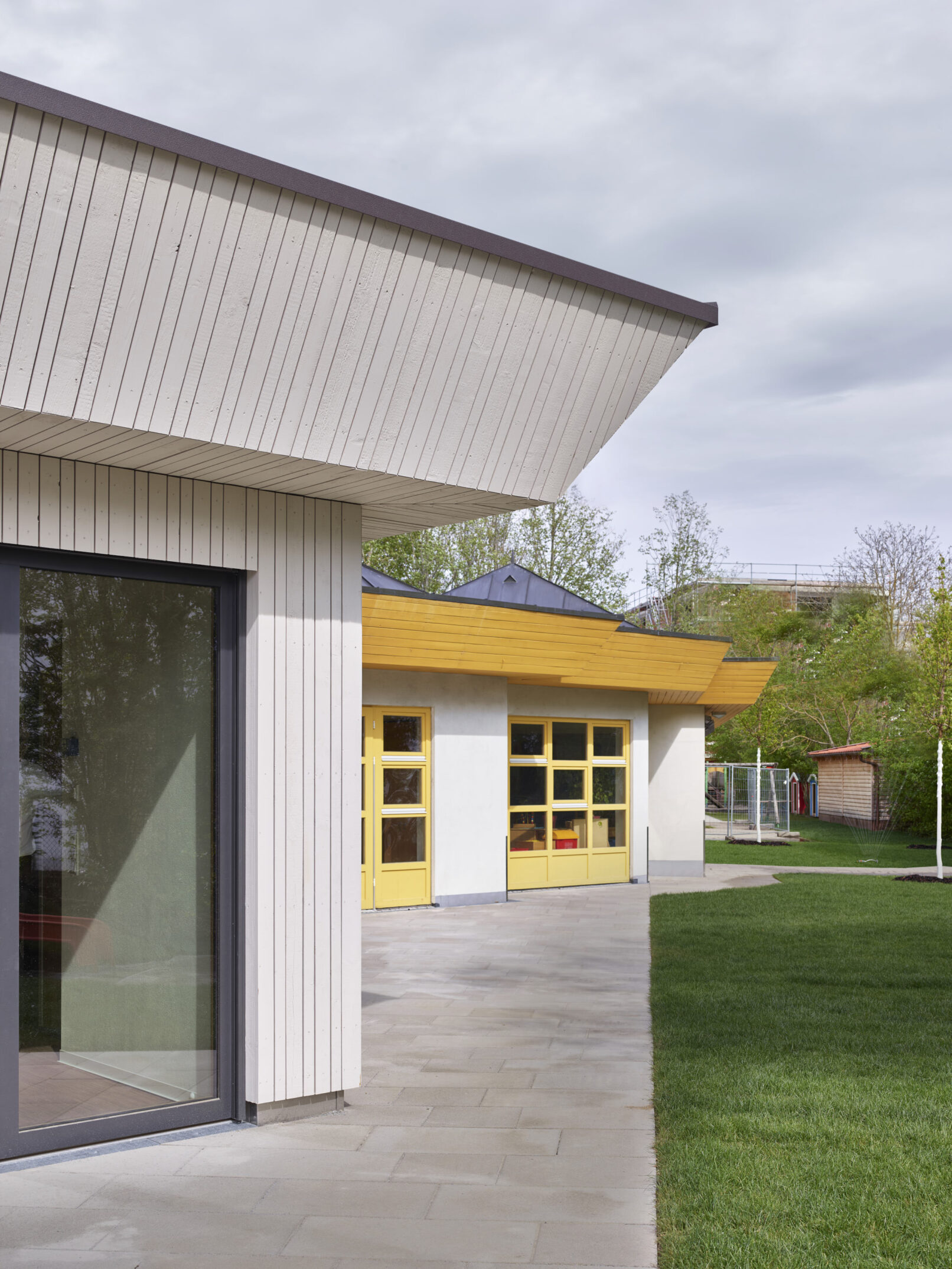 Der bestehende Kindergarten wird durch eine Hortgruppe mit ca. 22 Plätzen erweitert. Die nur nach Westen hin mögliche Kindergartenerweiterung nimmt die markante Form des Dachüberstandes auf und führt diese weiter. Die Raumhöhen werden vom Hauptgebäude übernommen. Die grosszügigen Fensteröffnungen sind bodentief angeordnet und ermöglichen den barrierefreien Zugang zur Terrasse. Der Massivbau besteht aus tragenden Ziegelmauerwerk mit Stahlbetonstützen und Stahlbetonelementen bei der Decke.