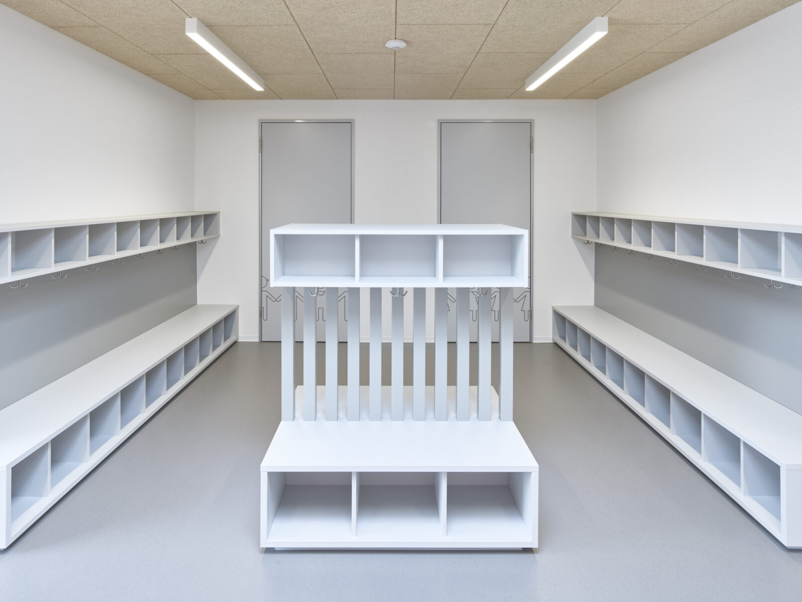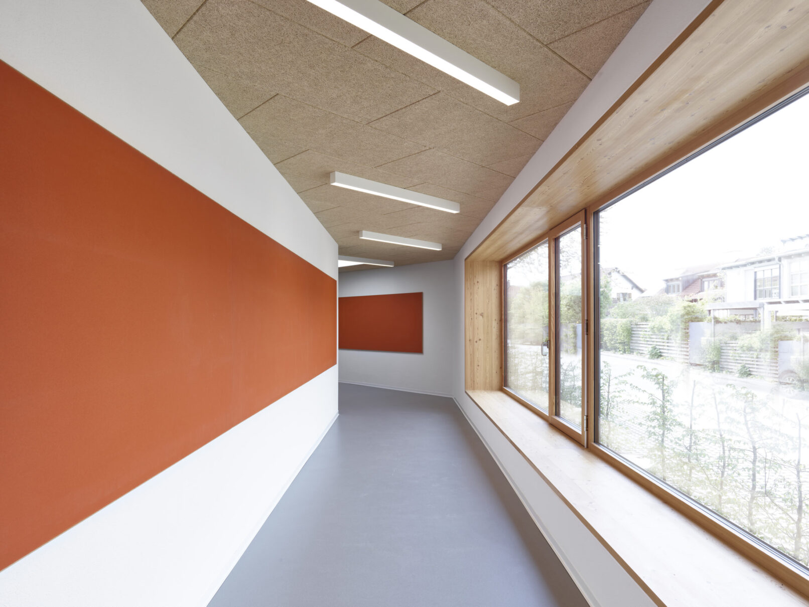 Die Fassade wird mit einer Wärmedämmung und einer sägerauen Holzschalung bekleidet, welche mit einem mineralischen Farbaufbau behandelt wird. Die Holz Aluminium Fenster und Pfosten-Riegel Elemente schließen die Öffnungen in der Fassade. Die Decken werden im Flur und den Gruppenräumen mit abgehängten Akustikdecken ausgeführt. Ein gefilzter Kalkputz bedeckt die Wände. Der Bodenbelag wird vom Bestandsgebäude in Form eines geölten Industrieparketts Eiche übernommen. Der Flurbodenbelag wird in Kautschuk weiter geführt.