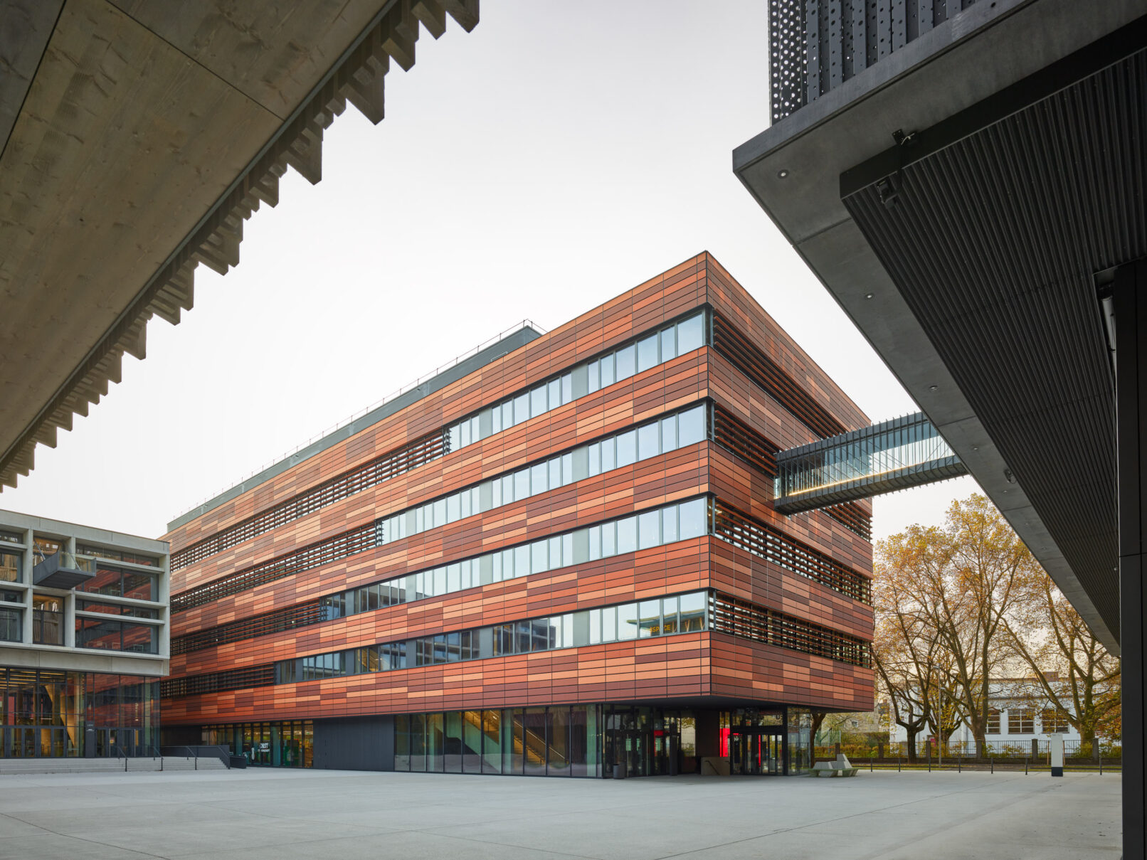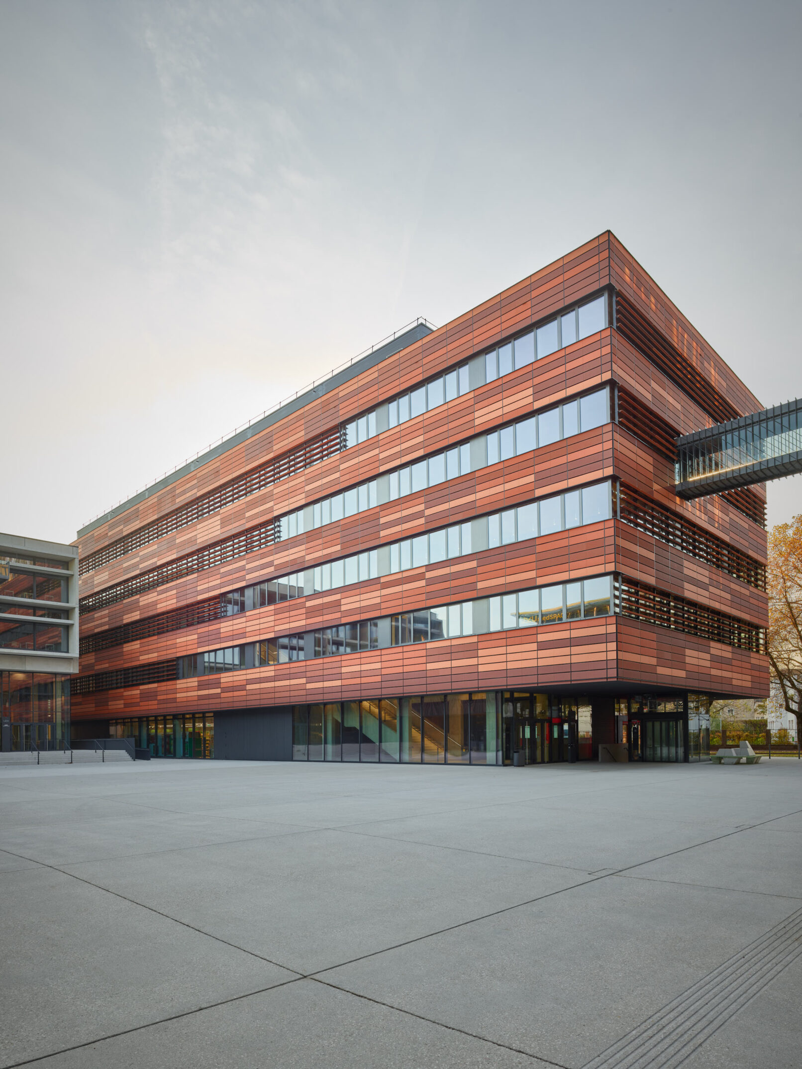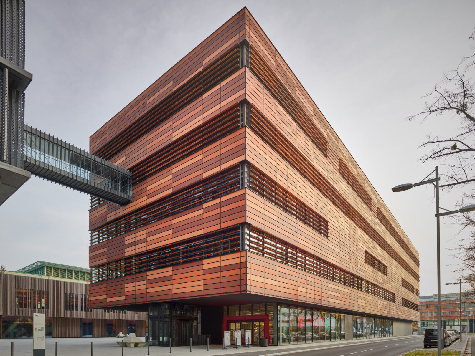 Während die Keramikplatten in den verschiedenen Rottönen dem großen Gebäude seine Leichtigkeit geben. Dieser Effekt wird durch die schwenkbaren Verschattungselemente verstärkt. Die Fassadenstruktur verändert sich regelmäßig – je nach dem welches Fenster zufällig verschattet oder geöffnet ist. D.h. die Fassade wird nie die selbe sein und wird stets ein unterschiedliches, optisches Ensemble bieten.