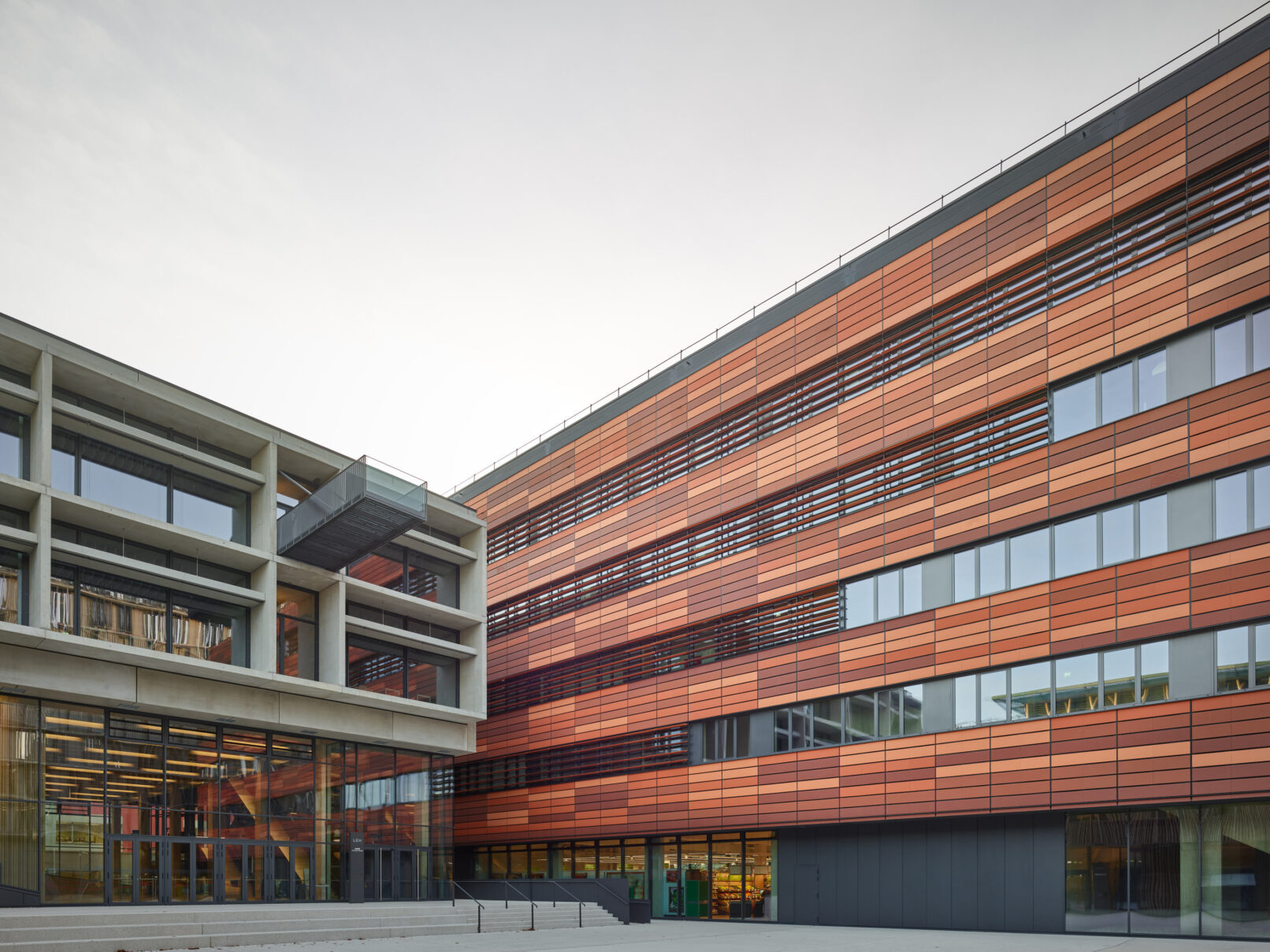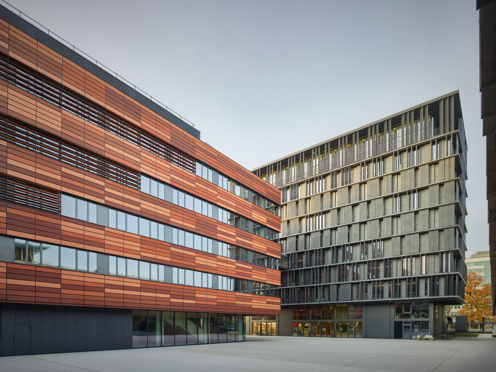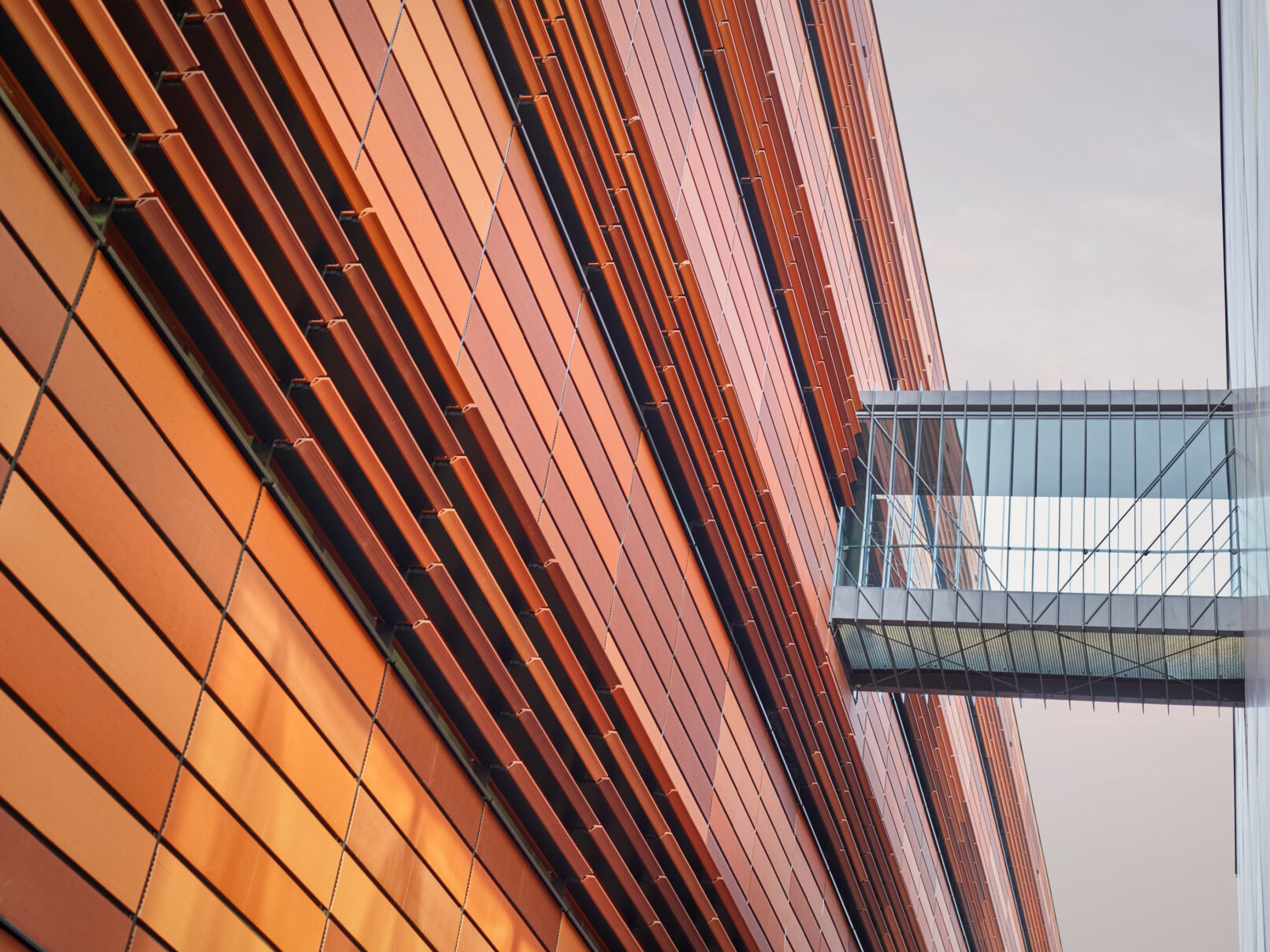 Während die Keramikplatten in den verschiedenen Rottönen dem großen Gebäude seine Leichtigkeit geben. Dieser Effekt wird durch die schwenkbaren Verschattungselemente verstärkt. Die Fassadenstruktur verändert sich regelmäßig – je nach dem welches Fenster zufällig verschattet oder geöffnet ist. D.h. die Fassade wird nie die selbe sein und wird stets ein unterschiedliches, optisches Ensemble bieten.