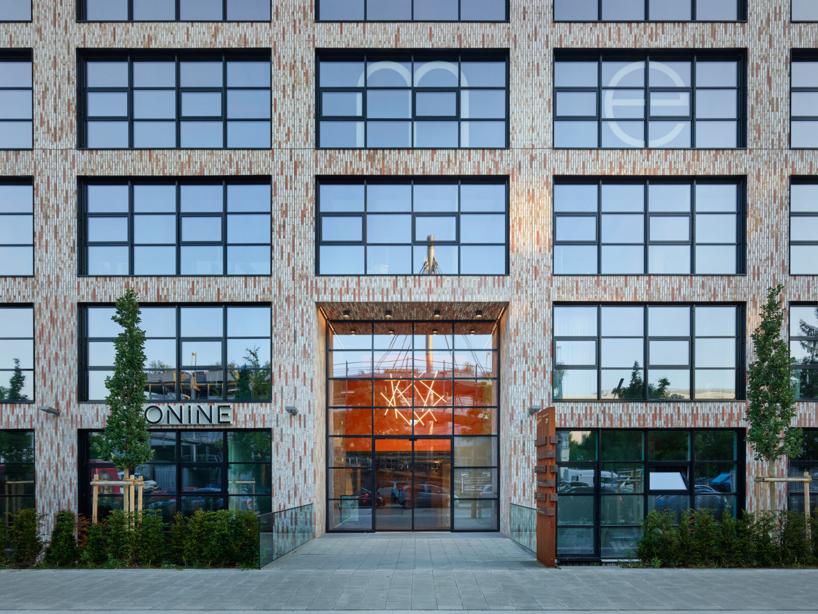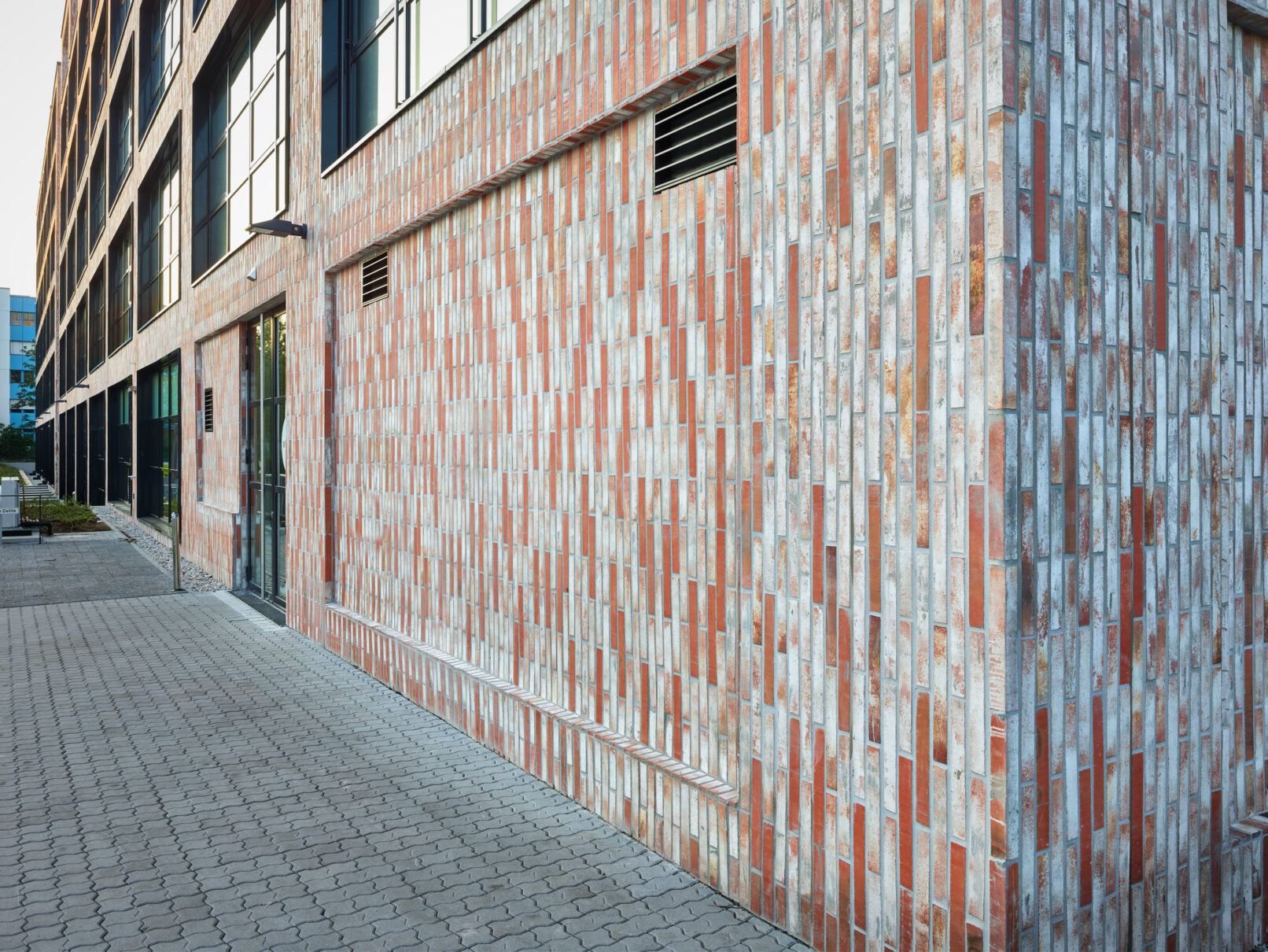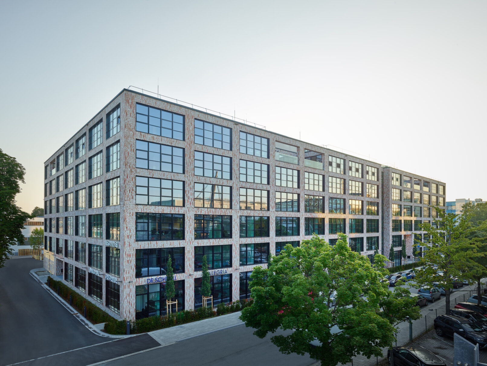 Im Münchner Norden ist ein neues Bürogebäude entstanden, das an bekannte Industriebauwerke der Moderne erinnert. Wie zum Beispiel an das Fagus-Werk in Alfeld von Walter Gropius und Adolf Meyer oder das Bauhaus Gebäude in Dessau, ebenfalls von Walter Gropius oder die Zeche Zollverein in Essen. Klar strukturierte, rechteckige Fassaden, oft mit horizontal verlegten Klinkern, großen Fenstern und Flachdächern.