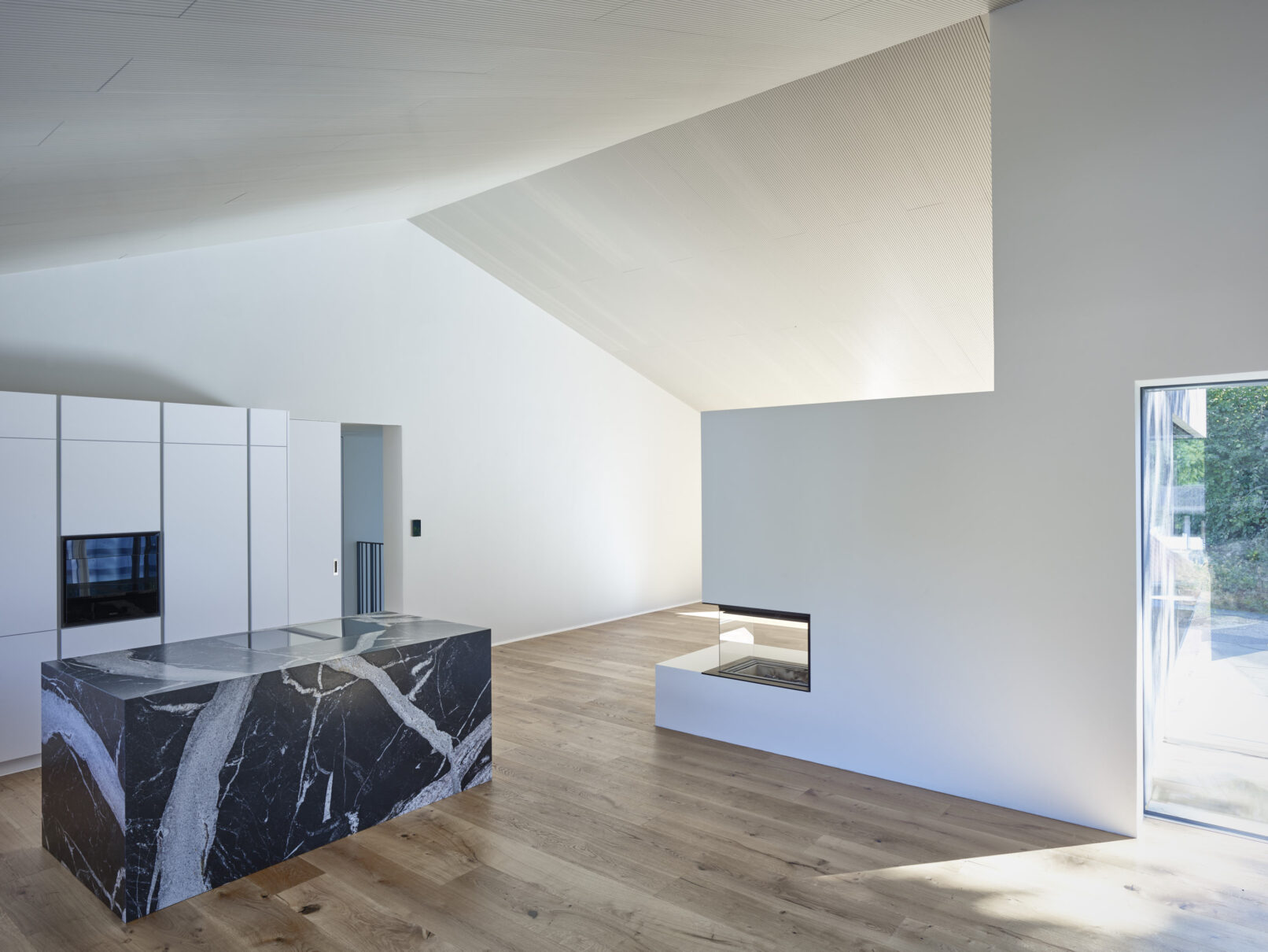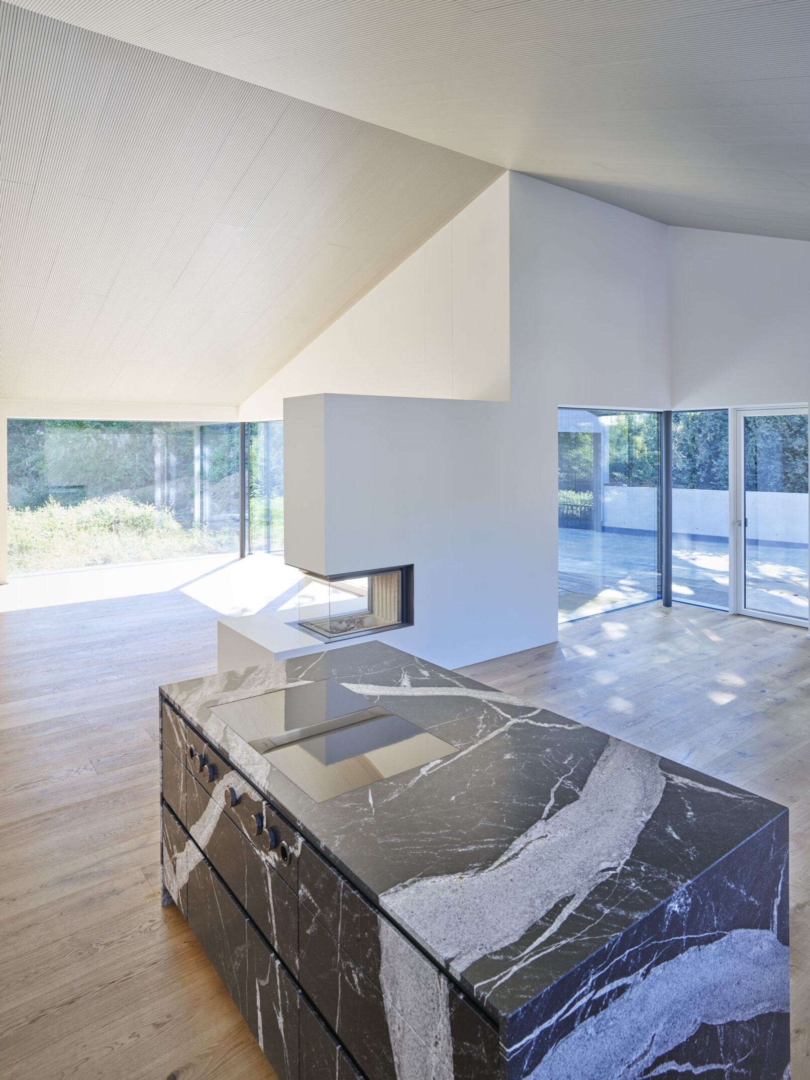 Die Grundform aus den 1960er Jahren und die tragenden Wände blieben erhalten, mit allen charmanten Vorzügen. Anders formuliert, ein Neubau hätte niemals so ausgesehen. Sei es zum Beispiel der Wohnraum mit hohen Decken und Giebel oder der zu große Eingangsbereich mit einer schräg verlaufenden Wand – der Grund hierfür ist nach wie vor unbekannt.